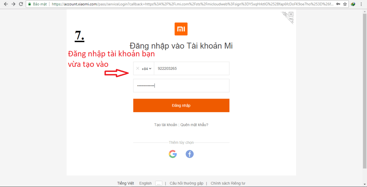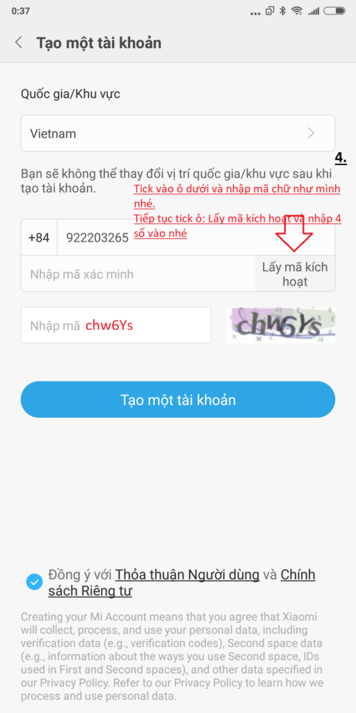Bước (4.) này xong , bạn sẽ đến phần nhập Mật khẩu Mi nữa là xong phần tạo Tài khoản Mi nhé.