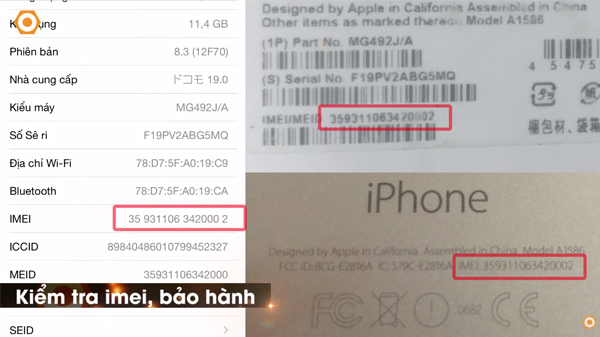 Việc đầu tiên chúng ta cần làm để có thể test iphone 6s chuẩn nhất đó là kiểm tra IMEI của máy. Với máy mới, cần kiểm tra IMEI ở trong phần cài đặt của máy + IMEI ở mặt sau hộp + IMEI mặt sau máy -> Nếu tất cả IMEI có 15 số trùng nhau thì chiếc iphone đó đạt chuẩn. Với máy cũ, do không còn hộp nên ta chỉ cần kiểm tra IMEI trong phần cài đặt và phía mặt sau máy. Đạt chuẩn khi 2 IMEI trùng nhau.