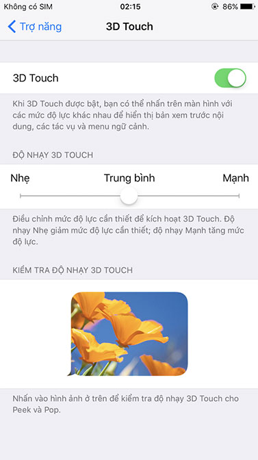 Để bật tính năng 3D Toch, các bạn cần vào phần Cài Đặt > Cài đặt chung > Trợ năng > 3D Touch và chọn “bật”. Ở phần này iPhone cho phép người dùng có thể tuỳ chỉnh độ nhạy của tính năng và sẽ có hình nền sẵn để thử. Nếu khi bấm mạnh máy đẩy hình ảnh to ra nghĩa là tính năng hoạt động ổn định.