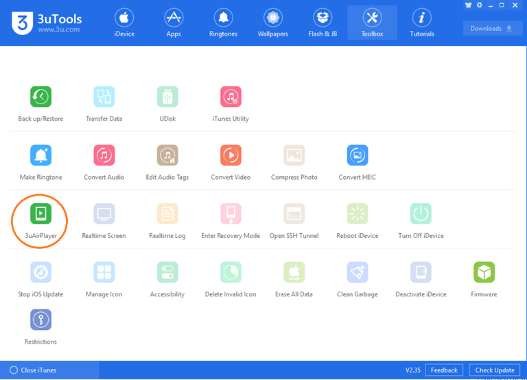 Sau đó vào mục “ToolBox” sẽ ra như hình và chọn “3uAirPlayer”