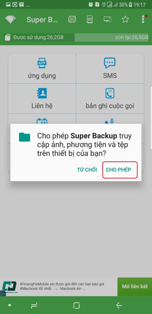 Khi bấm vào máy sẽ đòi hỏi chúng ta cấp quyền cho phép truy cập thì máy mới đọc được thông tin để tiến hành backup.