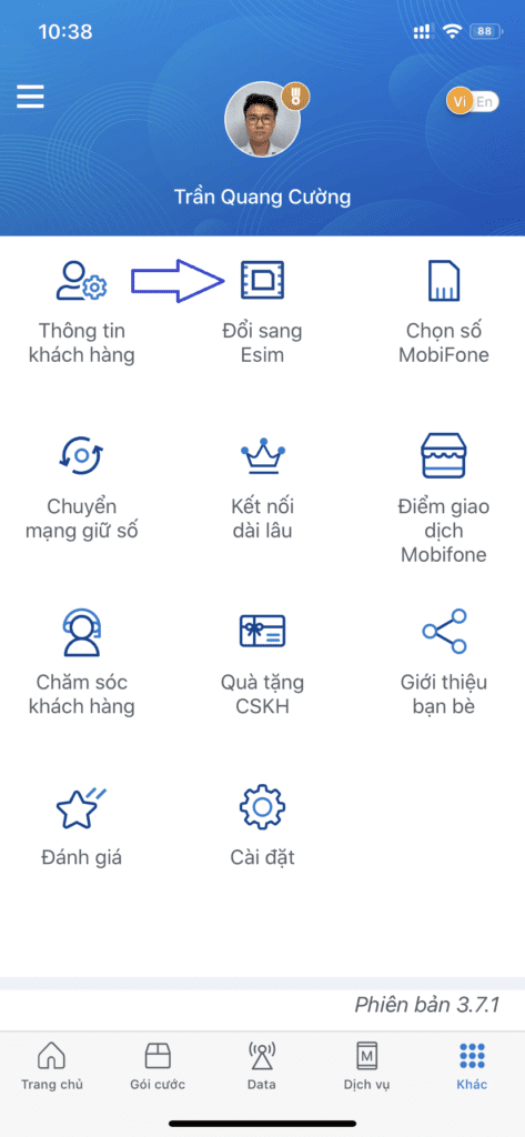 Sau đó các biểu tượng công việc sẽ hiện ra cho mình chọn, trong có có phần “Đổi sang eSim”. Thực hiện bấm vào đó để bắt đầu chuyển từ sim thường sang eSim.