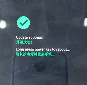 Khi có thông báo Update success! và dấu V được tích màu xanh lá thì ta giữ chặt nút nguồn để khởi động máy lên.