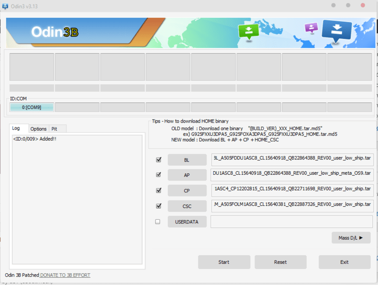 Mở Odin lên kiểm tra xem máy có nhận cổng COM chưa ( như hình ), Chọn các mục AP, BL, CP, CSC chọn tương ứng với các file trong ROM