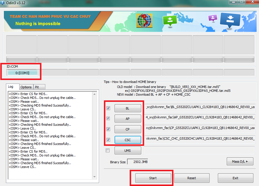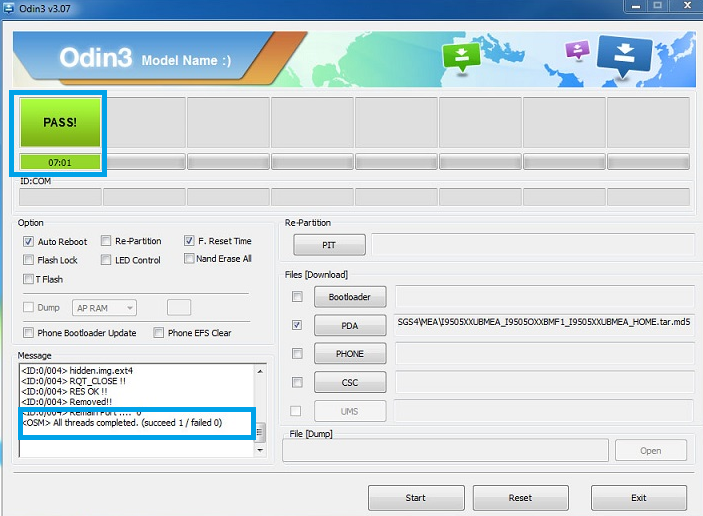 4. Sau khi chọn xong bấm START để bắt đầu cài Rom, đợi tới khi Odin báo succeed 1 và hiện PASS là OK