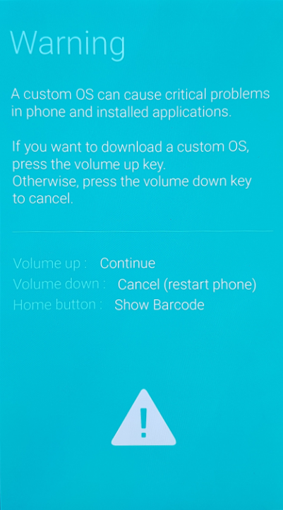 1. Tắt hẳn nguồn máy, đưa máy về chế độ Download Mode bằng cách bấm cùng lúc giữ 3 phím Nguồn + Home + Giảm âm lượng, khi vào màn hình chính nhả tay các phím, bấm Tăng âm lượng để vào giao diện Download Mode