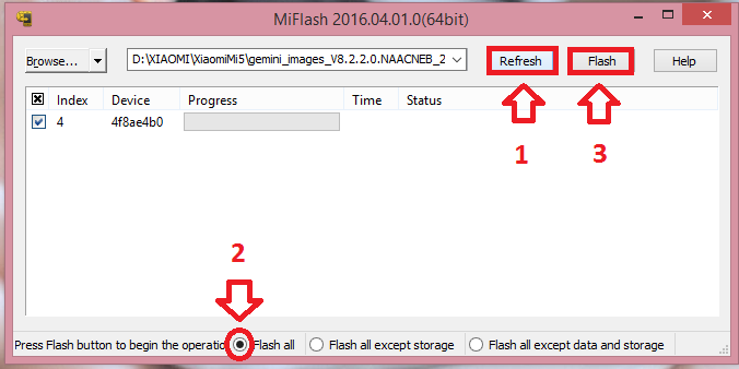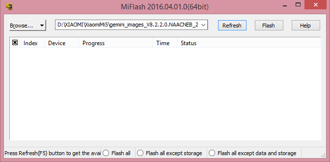 +Trên máy tính, chúng ta mở ứng dụng Mi Flash vừa cài ở trên, giao diện hoạt động của Mi Flash sẽ như sau: