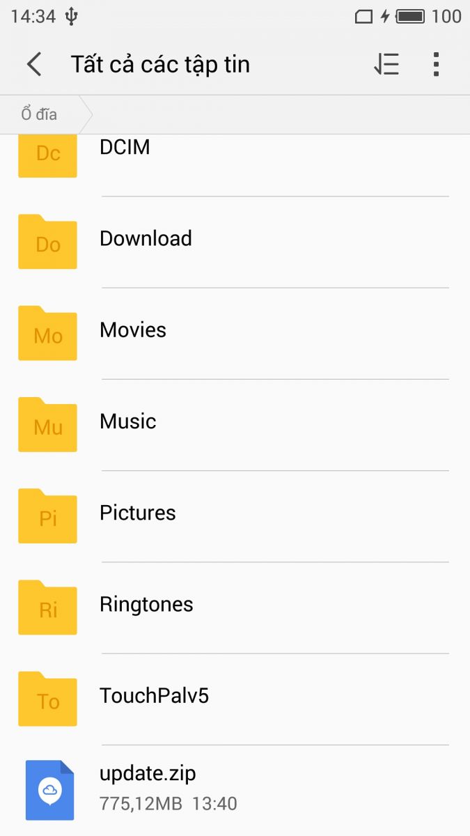 Bước 1 : Tải bản rom quốc tế về từ Link bên trên rồi tiến hành cắm cab usb vào điện thoại sau đó copy trực tiếp file Update.zip vào thư mục gốc bộ nhớ trong điện thoại.