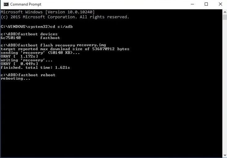 - Flash TWRP và boot vào TWRP: Trên CMD gõ tiếp 2 lệnh sau: