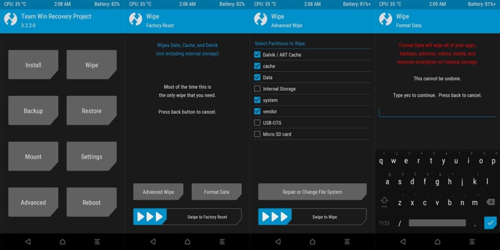 - Trở ra tiếp Menu -> Wipe -> Format Data -> nhập yes như hình 4. ( Bước này sẽ xóa hết dữ liệu của máy, bạn nhớ sao lưu ở nơi nào đó an toàn).
