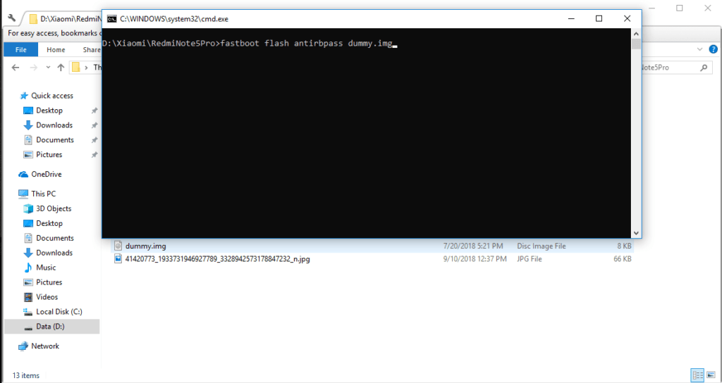 Shift + Right-click để mở CMD. Trong cmd nhập lệnh: fastboot flash antirbpass dummy.img