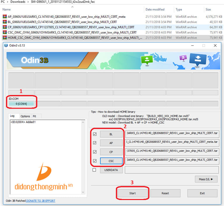 Bước 4: Ấn Start trên Odin để tiến hành cài ROM