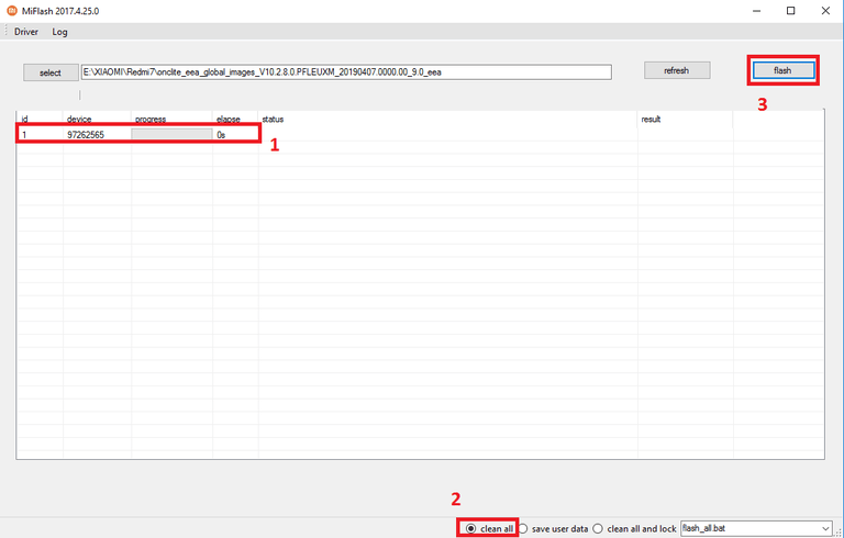 Bấm refresh cho tới khi hiện lên cổng id thiết bị như hình và tích vào clean all (nếu bạn muốn giữ lại giữ liệu ở bộ nhớ trong thì tích vào mục thứ 2 ở giữa save user data)