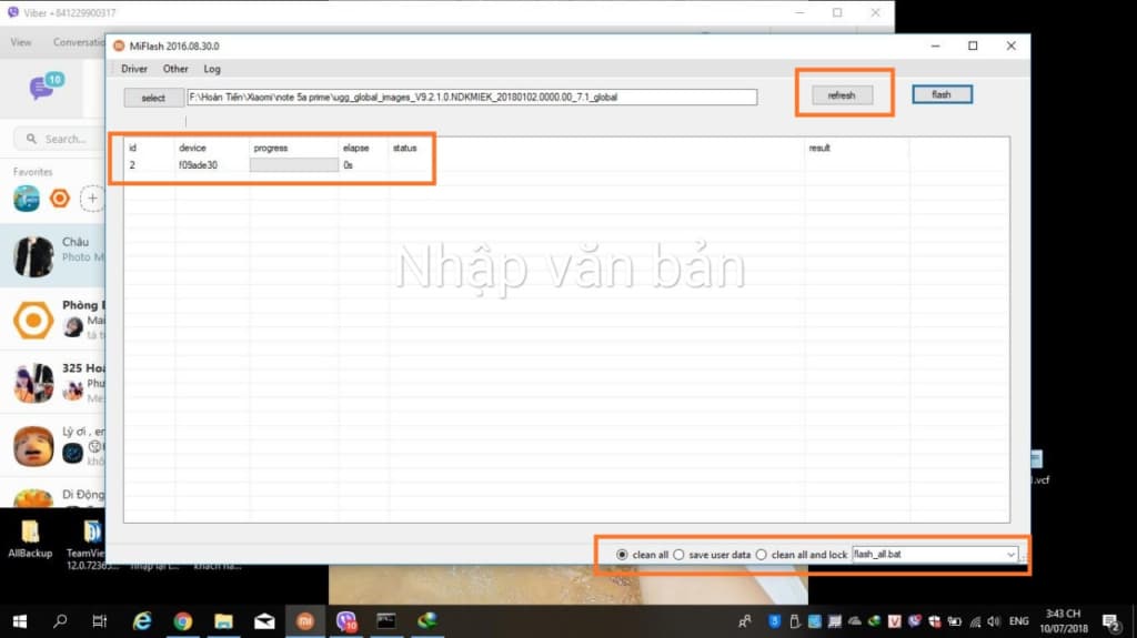 Bấm refresh cho tới khi hiện lên cổng COM hoặc id thiết bị như hình và tích vào clean all (nếu bạn muốn giữ lại giữ liệu ở bộ nhớ trong thì tích vào mục thứ 2 ở giữa save user data)