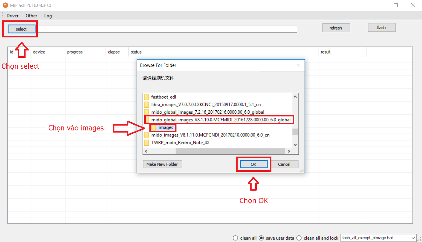 – Mở Mi Flash lên và chọn tới bản rom như hình dưới