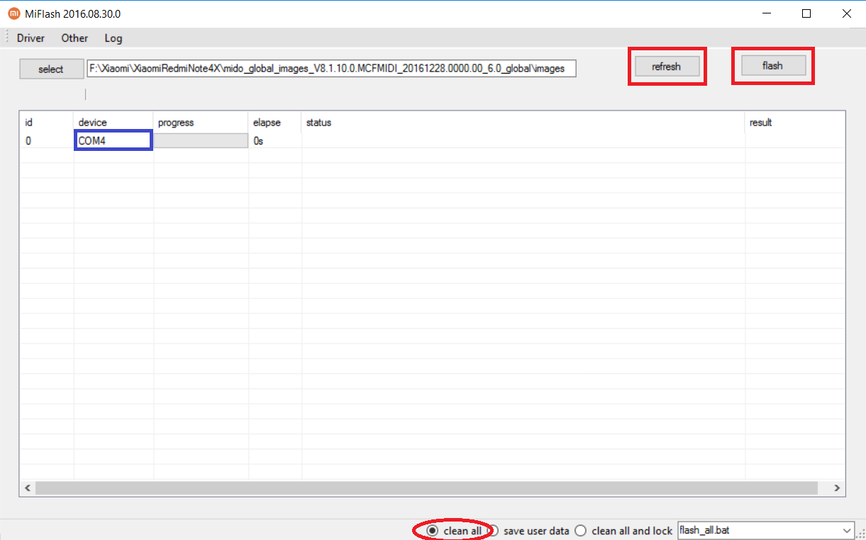 Bấm refresh cho tới khi hiện lên cổng COM và tích vào clean all (nếu bạn muốn giữ lại giữ liệu ở bộ nhớ trong thì tích vào mục thứ 2 ở giữa save user data)