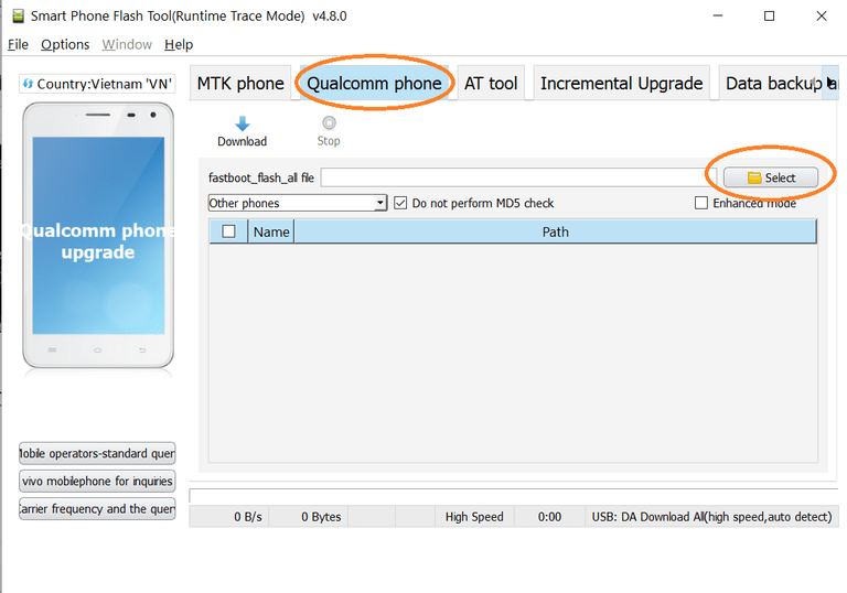 Bước 3 : Chọn Qualcomm Phone và chọ Select đến folder PD1602_A_1.17.0_vivo_qcom trong mục vừa giải nén