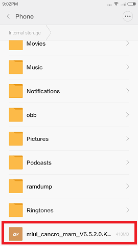 - Bước 6 : Chọn tới File ROM vừa nãy ta copy vào bộ nhớ trong, ở đây là File MIUI_Cancro_MAM_V6.5.2.0.KXDACNCD
