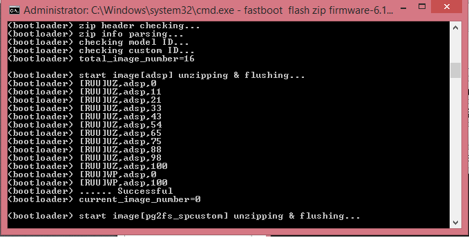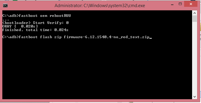 sau khi thực hiện lệnh xong gõ tiếp: fastboot flash zip firmware-6.12.1540.4-no_red_text.zip nhấn enter