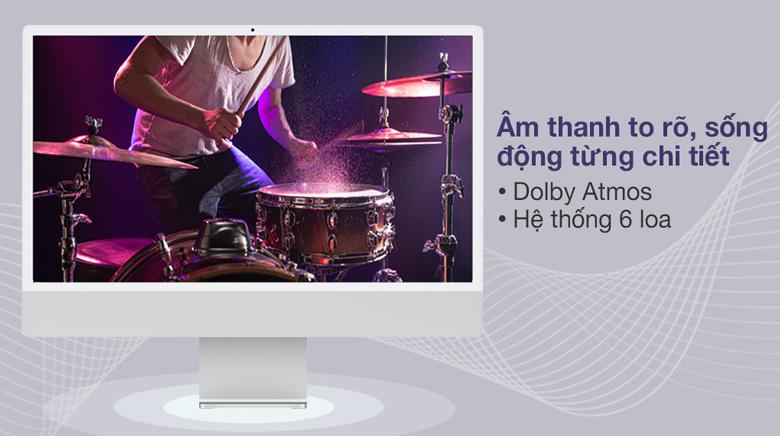 Apple M1 24" được trang bị công nghệ âm thanh Dolby Atmos danh tiếng với 6 loa kép, trong đó 2 cặp loa trầm được đặt cạnh nhau nhằm triệt tiêu rung động khi sử dụng. Hệ thống loa của iMac đem lại chất lượng âm thanh thuần khiết, giúp giải toả căng thẳng khi sử dụng.
