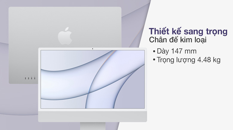 Thiết kế mới của iMac M1 24 inch 2021 quả thực đáng kinh ngạc khi thân hình đã được làm nhỏ gọn hơn rất nhiều so với các thế hệ iMac đời cũ. iMac 24" 2021 4.5K có độ mỏng chỉ 11.5mm, chiều dài 461 mm, rộng 540 mm và chỉ nặng 4.45 kg. Tất cả các chi tiết trên iMac M1 4.5K được các kỹ sư tính toán rất kỹ để có thể chứa được cấu hình mạnh mẽ bên trong thân hình nhỏ gọn này.