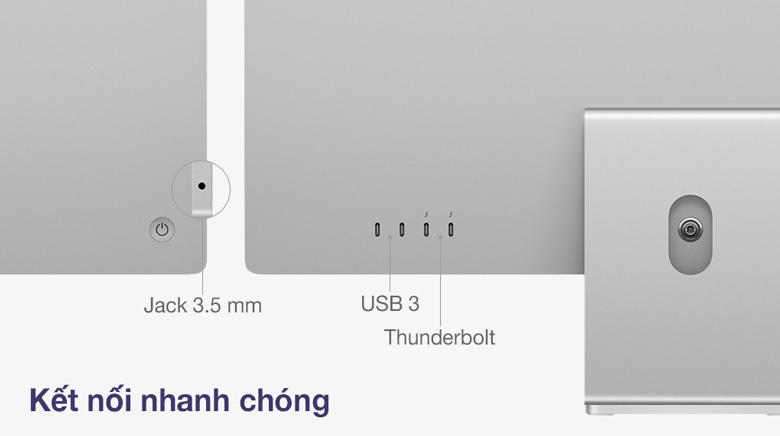 Trong hộp của iMac 24" 2021 có phụ kiện gồm 1 chuột Magic Mouse 2, 1 bàn phím Magic Keyboard có màu sắc tương đồng với iMac. Mặt sau của iMac M1 2021 8GPU 256GB Z12Q0004Q là nơi chứa những cổng kết nối, bao gồm trang bị 2 cổng cổng Thunderbolt tốc độ cao và jack cắm tai nghe 3,5mm vẫn được trang bị, hoàn toàn đủ khả năng truyền và xuất dữ liệu hình ảnh, video 5K với tốc độ lên đến 40 Gbps.