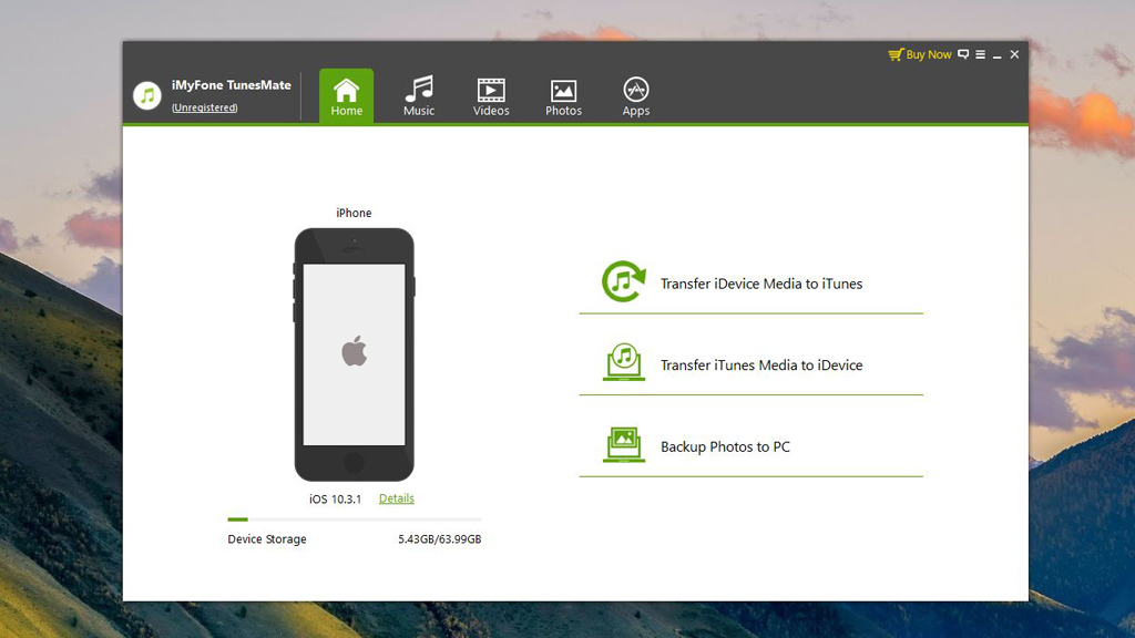 Bạn có thể tải về và trải nghiệm thử iMyFone TunesMate thông qua máy tính Windows. Sau khi cài đặt thành công, bạn cần kết nối điện thoại với máy tính và giao diện chính sẽ xuất hiện một số Home, Music, Videos, Photos và Apps.
