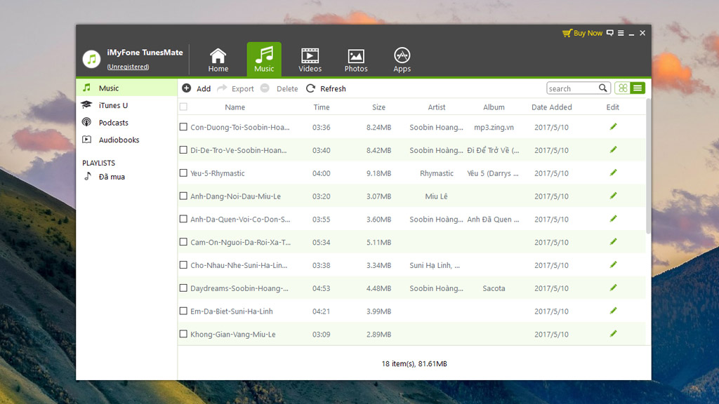 Music (Nhạc): Việc thêm, xóa, tạo danh sách những bài hát trên điện thoại cực kỳ phức tạp, nhất là với các thiết bị iOS. Tuy nhiên, tất cả đều có thể giải quyết một cách đơn giản với iMyFone TunesMate. Với công cụ này, bạn có thể thực hiện các thao tác trên chỉ một cách nhanh chóng.