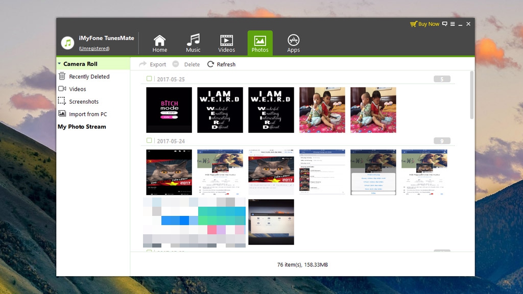 Photos (Hình ảnh): iMyFone TunesMate cung cấp cho người dùng hai chế độ sao chép hình ảnh là Camera roll (bộ nhớ máy), My Photo Stream (hình ảnh lưu trên đám mây của iCloud). Để tiến hành sao chép, bạn nhấn vào khu vực phân loại theo ngày hoặc tích trực tiếp lên bức ảnh mong muốn, sau đó nhấn Export để lưu hoặc để xóa.