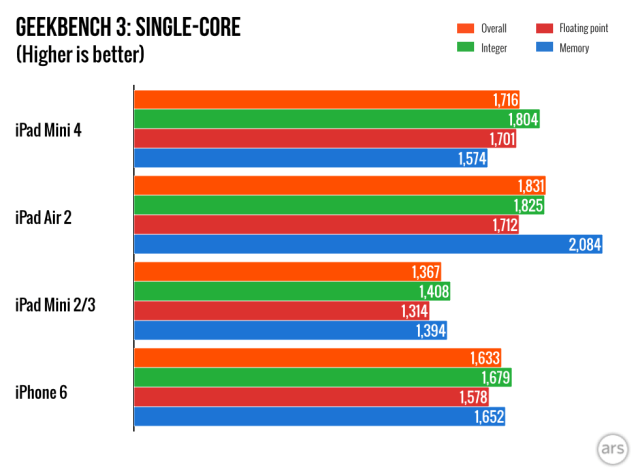 Thông tin iPad mini 4 đã xuất hiện trên cơ sở dữ liệu của Geekbench và Benchmark, cụ thể máy sử dụng chipset A8, Ram 2GB, điều đáng nói ở đây là xung nhịp xử lý của Chip A8 ở iPhone 6 và 6Plus chỉ 1.4GHz nhưng Chip A8 ở iPad mini 4 lại có xung nhịp lên đến 1.5GHz. Sự khác biệt này cũng không có gì lớn, nhưng đó lại là điểm đáng chú ý.