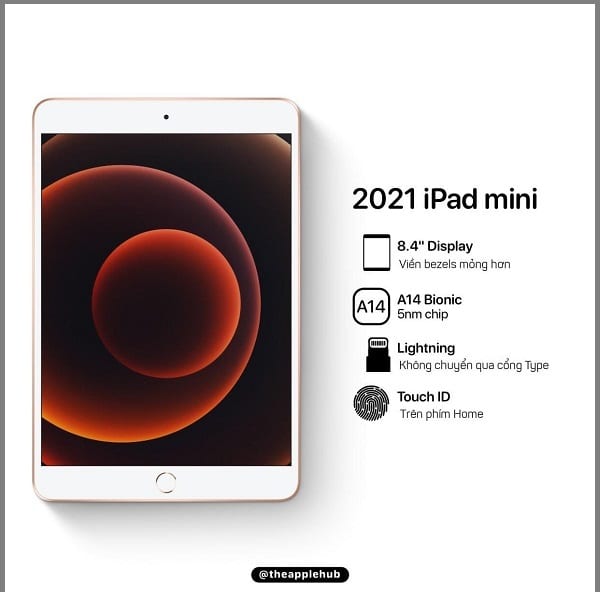 Theo thông tin mới nhất từ một leaker khá uy tín là @theapplehub cho biết rằng chiếc iPad Mini 6 sẽ có ngôn ngữ thiết kế giống như người đàn anh iPad Mini 5 trước đây khi được Apple hoàn thiện bằng khung kim loại nguyên khối cứng cáp và sang trọng. Điểm khác biệt là trên chiếc máy tính bảng sẽ có kích thước màn hình lớn hơn các thế hệ iPad Mni cũ.