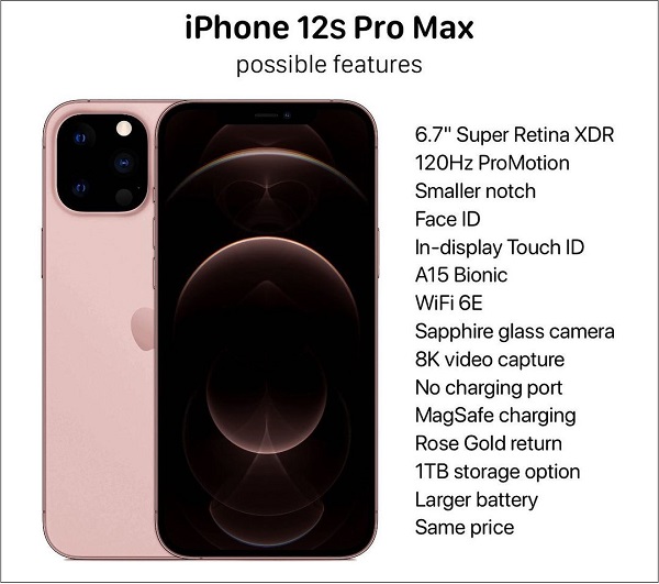 Có một thông tin thêm là Camera của iPhone 13 Pro Max sẽ được trang bị một lớp kính Sapphire để tăng cường bảo vệ cụm camera sau, camera cũng được nâng cấp độ phân giải quay video lên đến 8K. Tin đồn thêm về chân sạc cũng được tiết lộ khi nhiều khả năng iPhone 12s Pro Max sẽ không còn được trang bị cổng sạc, thay vào đó sẽ sử dụng công nghệ sạc không dây MagSafe. Ngoài ra, bộ nhớ của máy cũng được nâng cấp lên đến dung lượng 1 TB và màu Rose Gold cũng sẽ được đem trở lại.