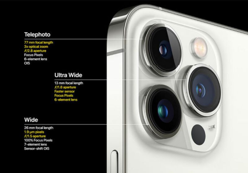 - iPhone 13 Pro Max vẫn tiếp tục sử dụng cụm ba camera trên mặt lưng. Trong đó bao gồm camera chính góc rộng đi kèm một camera góc siêu rộng và camera tele hỗ trợ tác vụ zoom, cả ba camera này đều ghi nhận độ phân giải 12MP.