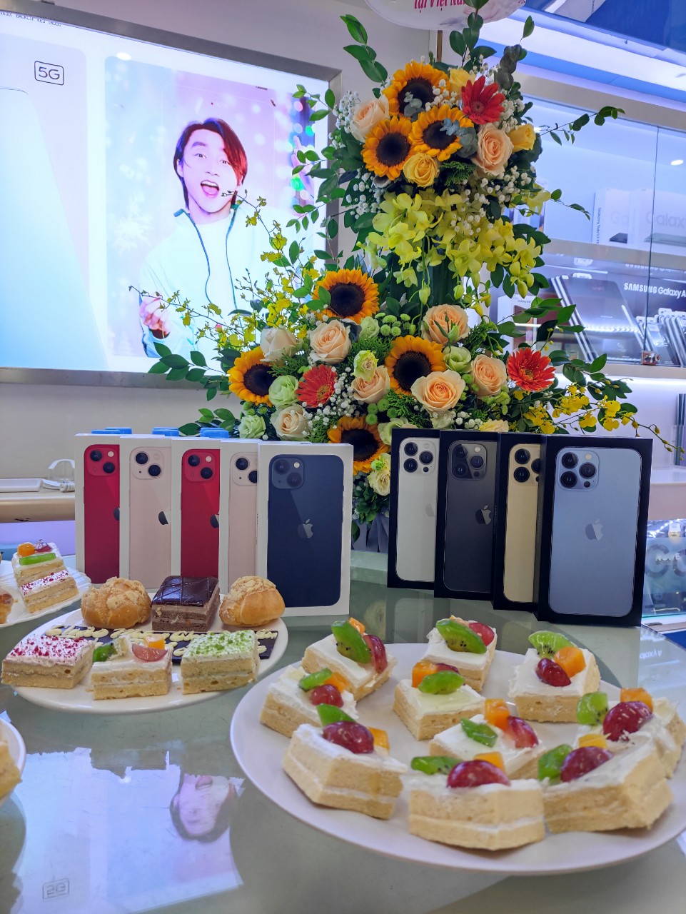 Khách hàng trúng đợt 1 sẽ được chuyên viên Di Động Thông Minh gọi điện mời qua cửa hàng, vì nhận hàng sớm nên tại đây cũng chuẩn bị sẵn rất nhiều bánh ngọt để khách hàng ăn sáng.