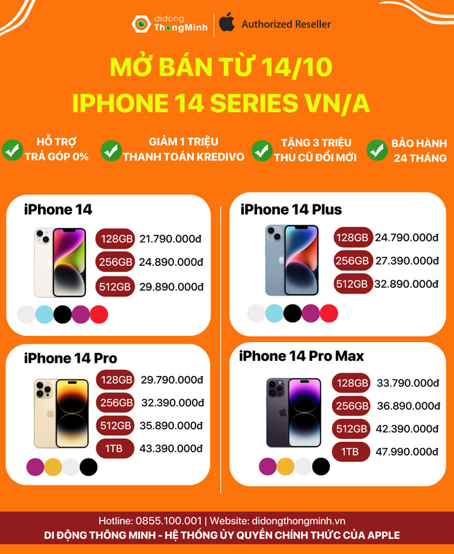 Không như dự đoán của các chuyên gia, iPhone 14 Pro 128GB vẫn có giá như iPhone 13 Pro lúc mới ra mắt. Giá cụ thể của sản phẩm chỉ từ 30 triệu VNĐ cho phiên bản 128GB.