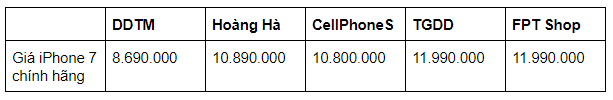 Trước hết, chúng ta sẽ bàn về mức giá của iPhone 7 mới. Theo đó, sản phẩm này đang có mức giá dao động từ 8.7 triệu đến gần 12 triệu đồng. Cụ thể: