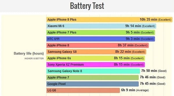 Pin – Dung lượng pin của máy là 2691 mAh không phải là một con số khủng nhưng với bộ điều khiển A11 giúp cho iphone 8 plus tối ưu được thời gian xử lý tác vụ cũng như tiêu thụ năng lượng. Dưới đây là bảng so sánh thời gian sử dụng Pin của 8 plus vói các Smartphone cùng thời.