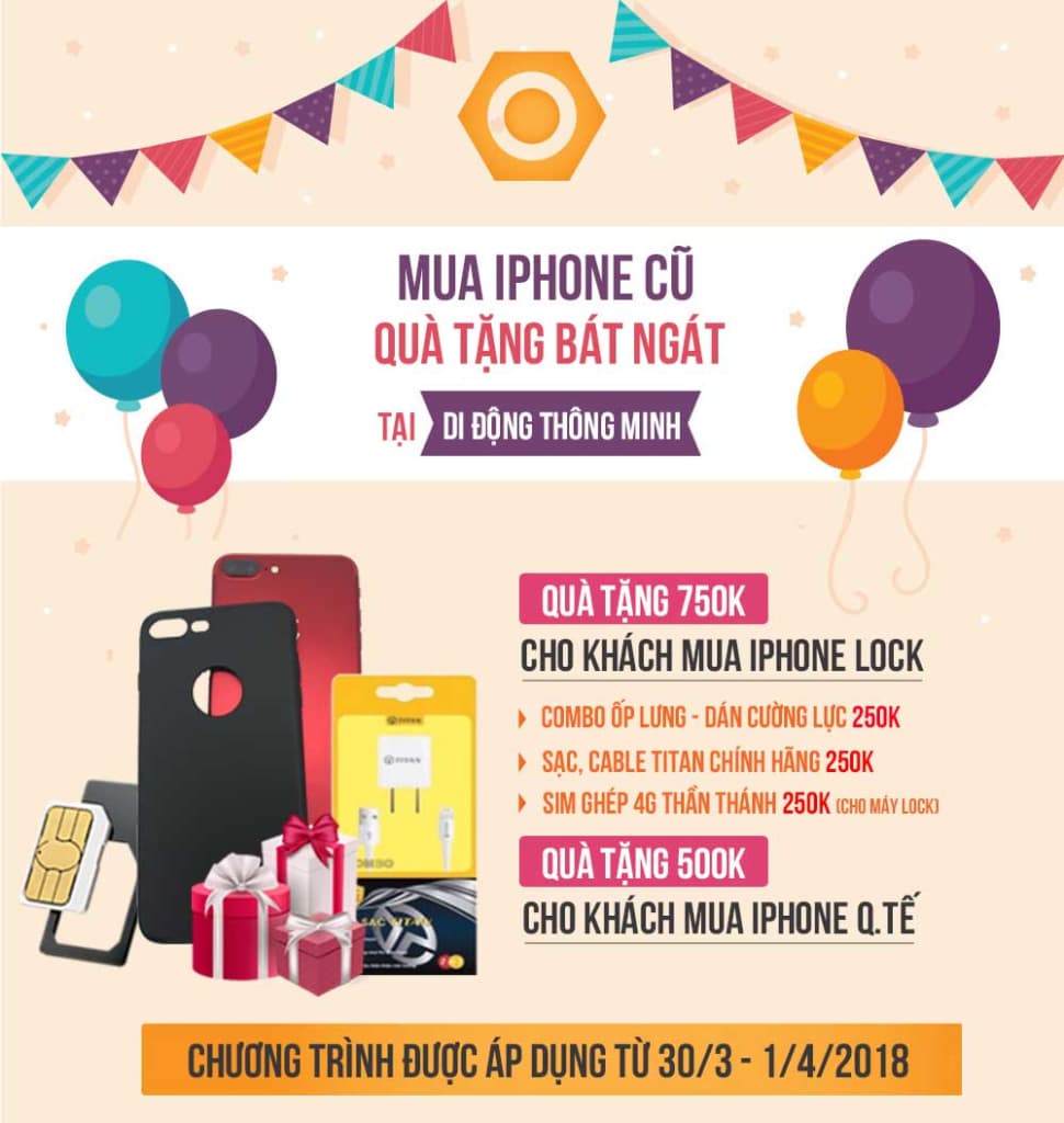 Với chương trình khuyến mại cuối tuần từ 30/3 – 1/4/2018, các bạn khi mua các sản phẩm iPhone cũ nào tại tại Di Động Thông Minh như: iPhone 7, 7 Plus, iPhone 6S, 6S Plus, iPhone 6, 6 Plus, iPhone SE cả bản Lock và Quốc tế sẽ có cơ hội nhận được combo quà tặng hấp dẫn