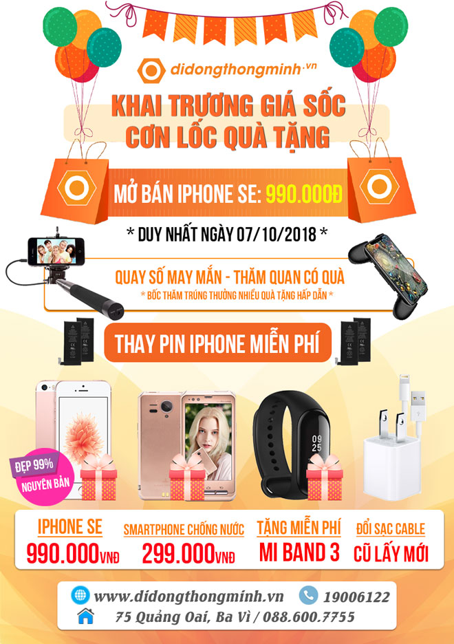 Trong ngày khai trương 07/10/2018, Di Động Thông Minh sẽ dành nhiều suất ưu đãi 17 suất mua iPhone SE quốc tế cũ, nguyên bản với giá cực sốc chỉ 990.000vnđ. Tất cả khách hàng đến mua hoặc thăm quan đều có cơ hội mua chiếc iPhone SE này. Theo đó khách hàng tham dự sẽ có cơ hội quay vòng quay may mắn từ 08h-09h ngày 07/10/2018 để có thể nhận được những ưu đãi sau: