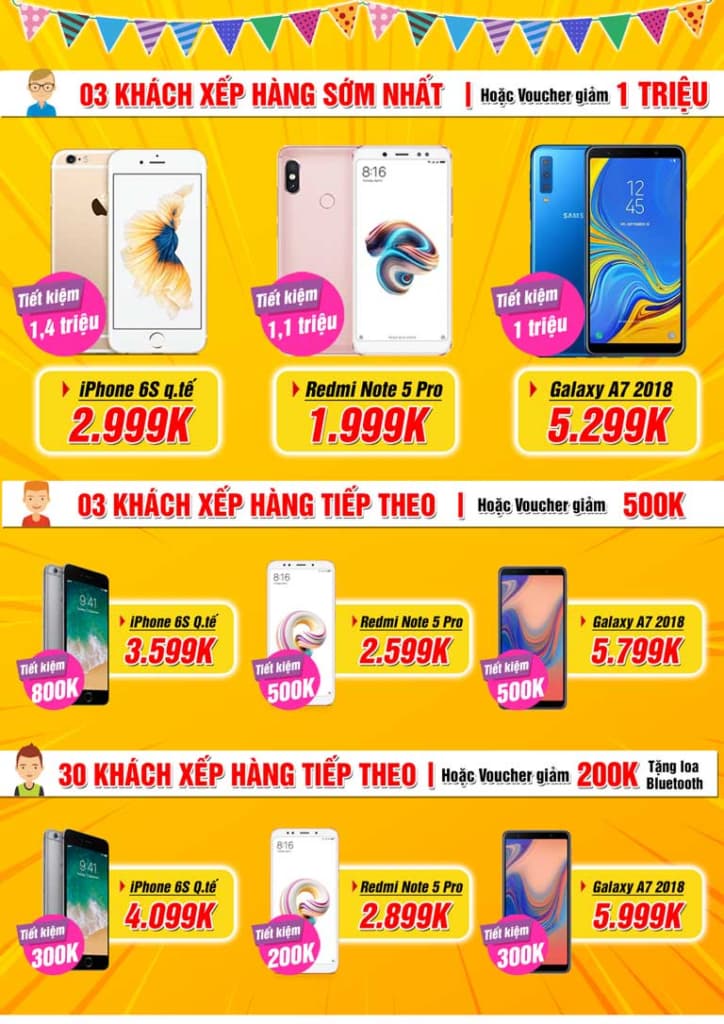 >> Hình thức mua hàng: Tại 26 Âu Cơ sẽ có 36 suất mua hàng sớm nhất, chia làm 3 hàng rào duy băng xếp hàng, mỗi hàng 15 khách lần lượt dành để mua các suất ưu đãi iPhone 6S, Redmi Note 5 Pro và Galaxy A7 2018 giá sốc. Chi tiết như sau: