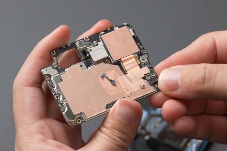 Phần bo mạch chủ của máy được dán 1 lớp lá đồng tản nhiệt cho các khu vực xử lý.