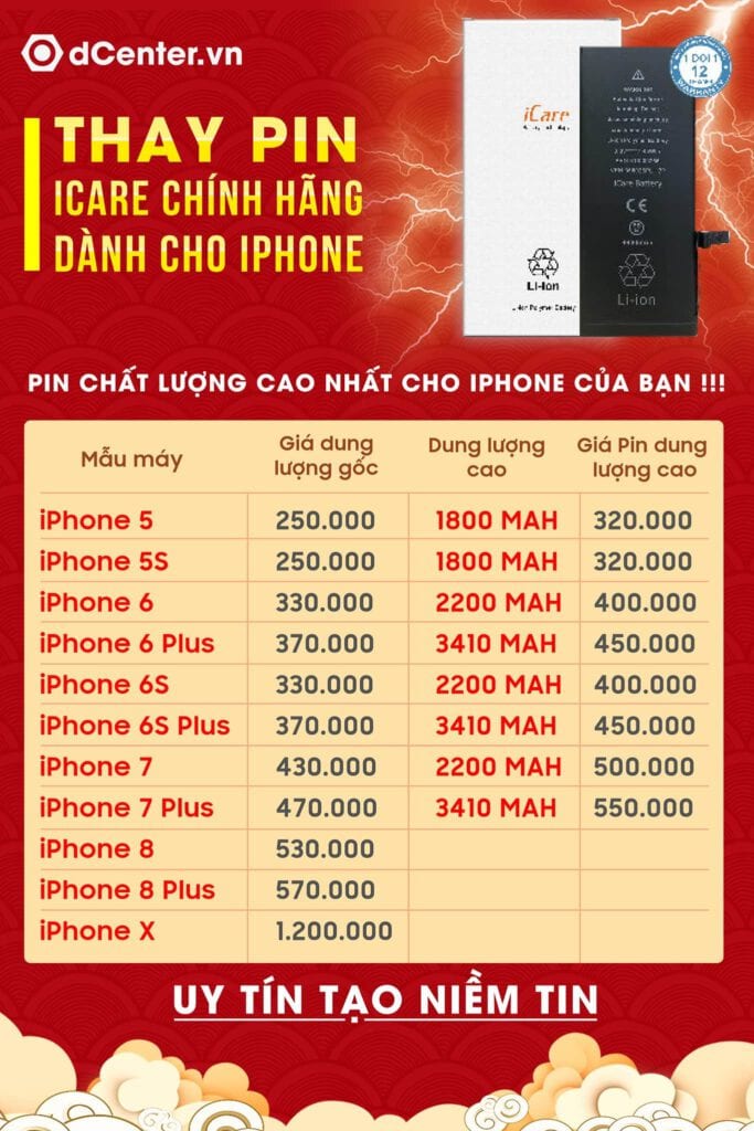 - Pin iCare: Thương hiệu pin chất lượng cao, Cell pin và mạch pin được sản xuất tại chính công ty chịu trách nhiệm sản xuất pin cho Apple, có 2 loại pin là pin “dung lượng thường” và pin “dung lượng cao”. Pin thường thì có thiết kế công suất tương đương pin Zin Apple, pin dung lượng cao thì có thiết kế dung lượng pin nhiều hơn 20-25% so với pin zin nên lợi thế sử dụng sẽ khoẻ hơn rất nhiều pin zin, tuổi thọ đạt trên 1000 lần sạc xả. Bảo hành 1 đổi 1 trong vòng 12 tháng nếu hư hỏng pin.