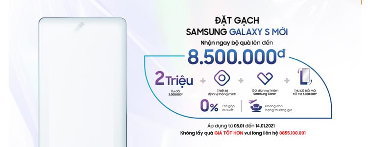 Mặc dù còn khoảng 1 tuần nữa bộ 3 Galaxy S21 ra mắt, nhưng hiện tại DĐTM đã có chương trình đặt gạch với ưu hấp dẫn lên đến 8.5 triệu bao gồm: