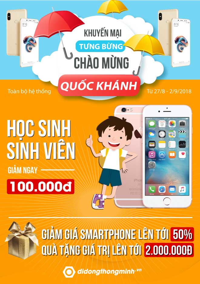 Với chương trình khuyến mại mừng đại lễ 2/9 tại Di Động Thông Minh từ 27/8 cho tới 2/9/2018, khách hàng sẽ có cơ hội nhận được ngay những ưu đãi vô cùng hấp dẫn: