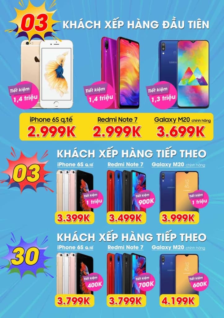 3. Bán hàng giá sốc Redmi Note 7 2.999K, iPhone 6S 2.999K, Galaxy M20 3.699K cho khách xếp hàng sớm nhất
