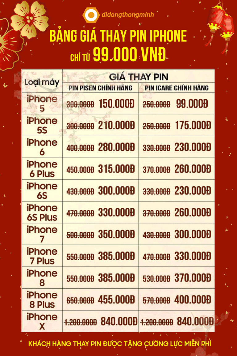 Tham khảo bảng giá thay pin iPhone giá chỉ từ 99.000đ dưới đây: