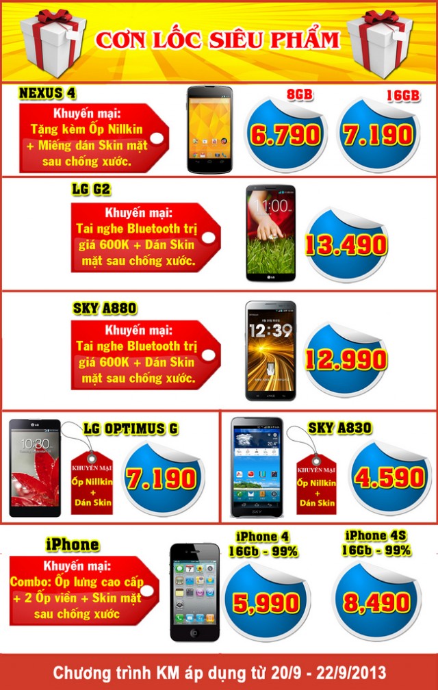 Di động thông minh xin gửi tới các bạn chương trình Khuyến mại: Cơn lốc siêu phẩm, với việc giảm giá lớn cùng với những quà tặng hấp dẫn khi các bạn lựa chọn những Smartphone hàng đầu thị trường hiện nay như: Sky A880, LG G2, hay Nexus 4 với hệ điều hành Android 4.3 mới nhất. Bên cạnh đó 2 mẫu điện thoại tầm trung cũng đang khá hót đó chính là chiếc Optimus G và Vega Racer 2 cũng là những sản phẩm phù hợp với những người dùng trung cấp. Chúc các bạn có được sự lựa chọn hợp lý.