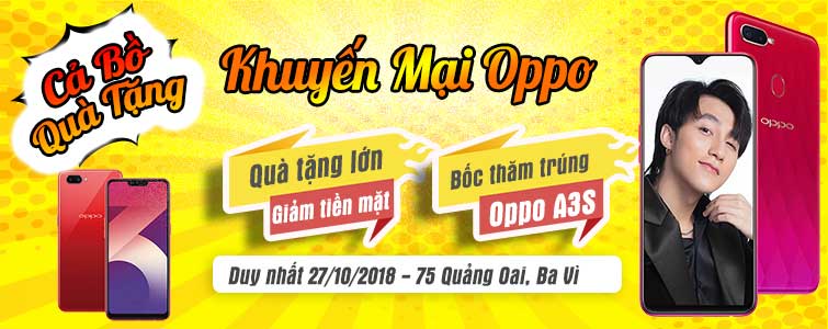 Duy nhất trong ngày 27/10/2018 tại Showroom 75 Quảng Oai, Ba Vì, Hà Nội, tất cả khách hàng đến thăm quan, trải nghiệm đều nhận được phiếu bốc thăm để có cơ hội trúng chiếc Oppo A3S (2GB/16GB) chính hãng trị giá 3.690.000vnđ. Chương trình bốc thăm diễn ra vào lúc 19h30 cùng ngày
