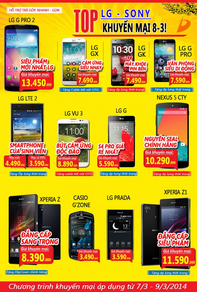 Để tri ân khách hàng, hướng về 1 nửa thế giới, Di động thông minh xin gửi tới tất cả các bạn chương trình Khuyến mãi nhân ngày mùng 8/3 với việc giảm giá kịch sàn các sản phẩm Smartphone đang được quan tâm cùng những quà tặng hấp dẫn. Khuyến mại được tổ chức từ 7 – 9/3/2014 đặc biệt trong ngày 8/3 giảm trực tiếp thêm 100.000đ tiền mặt vào sản phẩm cho tất cả khách hàng nữ khi mua (chỉ áp dụng với máy xách tay). Chúc các bạn có những món quà ý nghĩa dành cho phái đẹp trong ngày 8/3 này