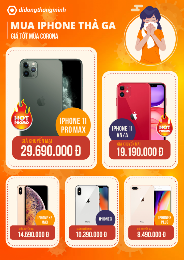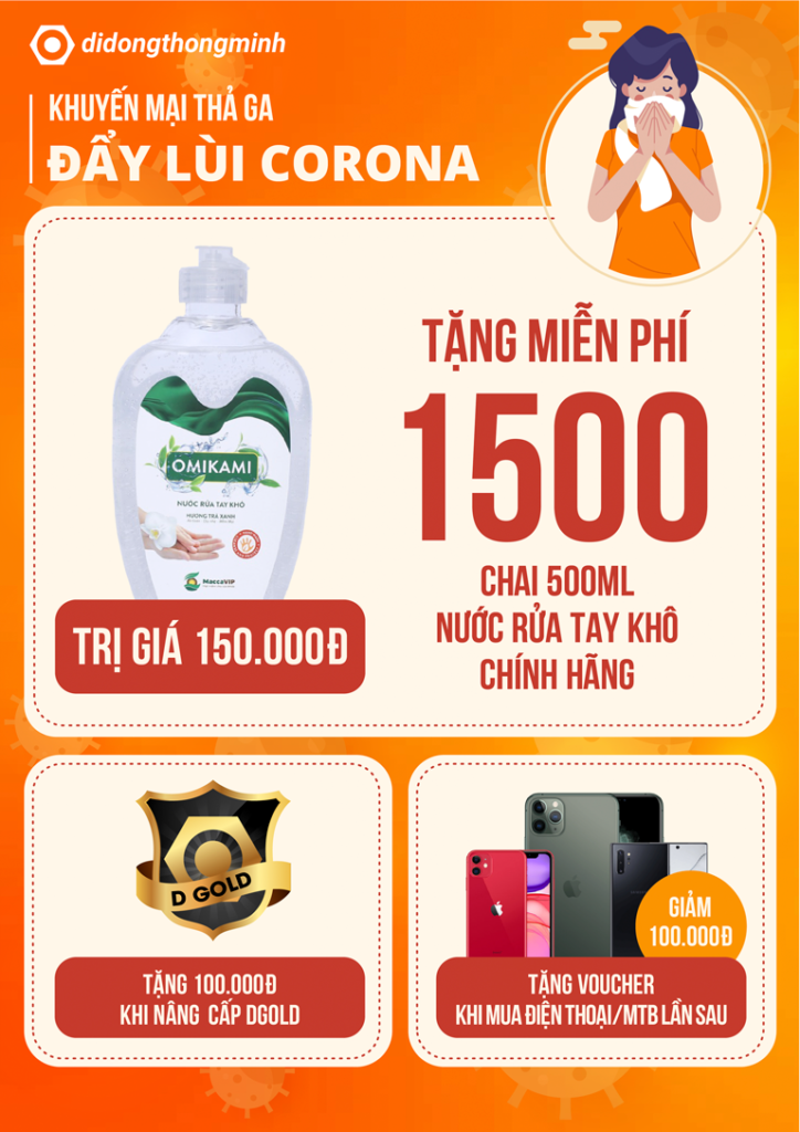 Hiện nay, hầu hết mọi người đều rất khó tìm mua các sản phẩm bảo vệ sức khoẻ như khẩu trang y tế, nước rửa tay sát khuẩn,… hoặc phải mua với mức giá rất cao. Hiểu được điều đó, Di Động Thông Minh tri ân khách hàng với chương trình “Khuyến mãi thả ga – Đẩy lùi corona: Nhận ưu đãi 400.000đ” để khách hàng vừa mua được những món đồ công nghệ với GIÁ ƯU ĐÃI NHẤT, vừa được TẶNG MIỄN PHÍ 500ml nước rửa tay khô chính hãng trị giá 150.000đ.